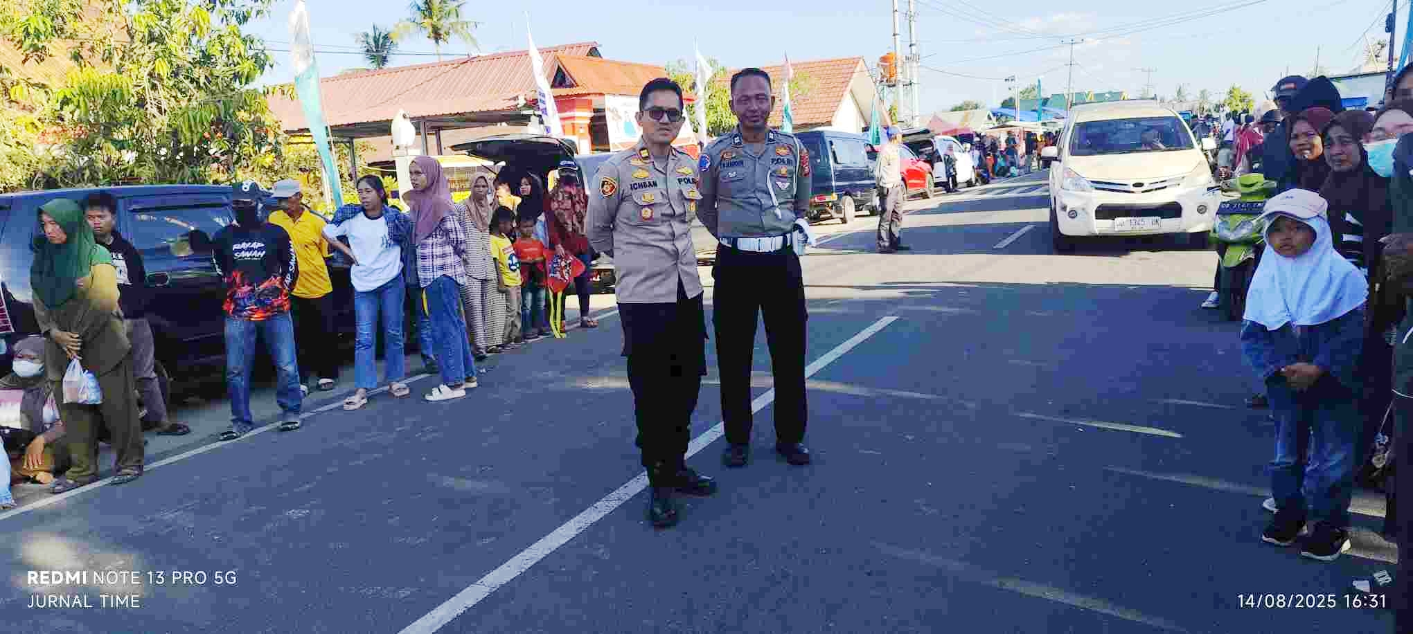 Aiptu Tajuddin, Danpos Lantas Batu-Batu, bersama Kapolsek Marioriawa Iptu Muh. Ichsan Azis, SH., M.M., turun langsung melaksanakan pengaturan arus lalu lintas di titik penghormatan gerak jalan indah, tepatnya di depan Kantor Desa Tellulimpoe.